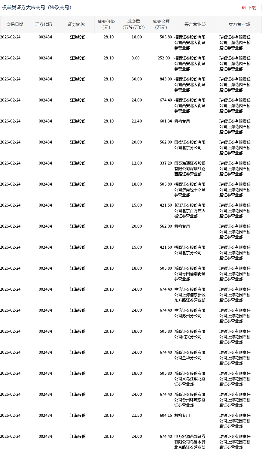 2月24日,江海股份大宗交易成交790.8万股,成交额2.22亿元,占当日总成交额的18.69%,成交价28.1元,较市场收盘价31.18元折价9.88%。