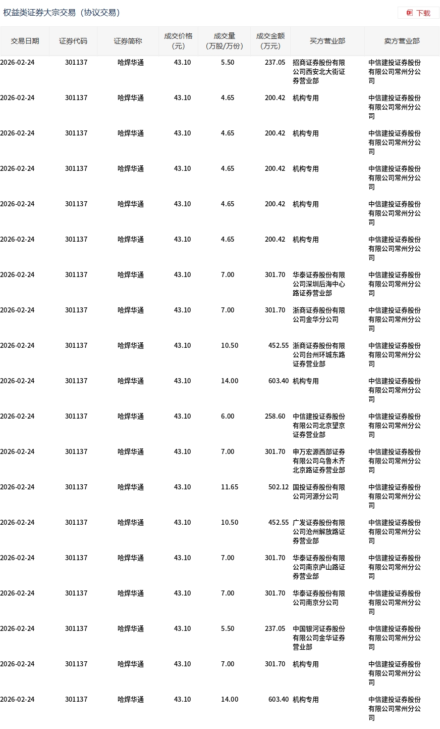 2月24日,哈焊华通大宗交易成交142.9万股,成交额6159.02万元,占当日总成交额的22.62%,成交价43.1元,较市场收盘价51.51元折价16.33%。